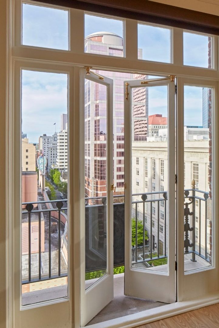 This 8th Floor studio has an aerie view of downtown Portland. The lights of the theatre district up Broadway are enchanting at night. Overlooking the ornate steeple to the north is reminiscent of architecture in many cities of Europe. Lofty views to the east and south highlight the lovely Portland skyline. Every studio is unique with many different floorplans and views. Which one will be your favorite? Reserve your urban Pied-a-Terre today!