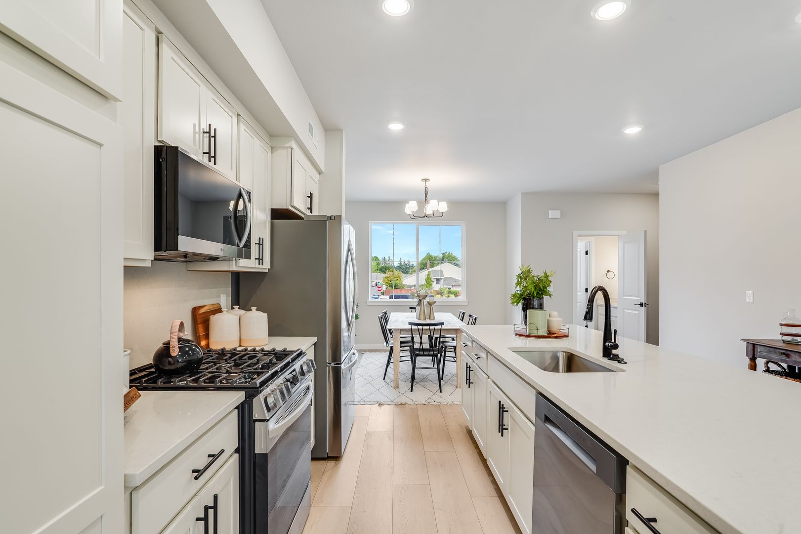 Stainless steel appliances including dishwasher, microwave, and garbage disposal